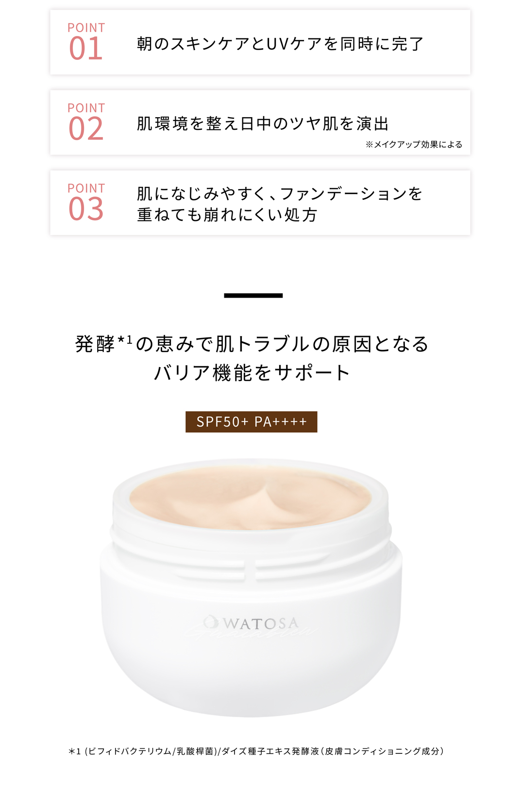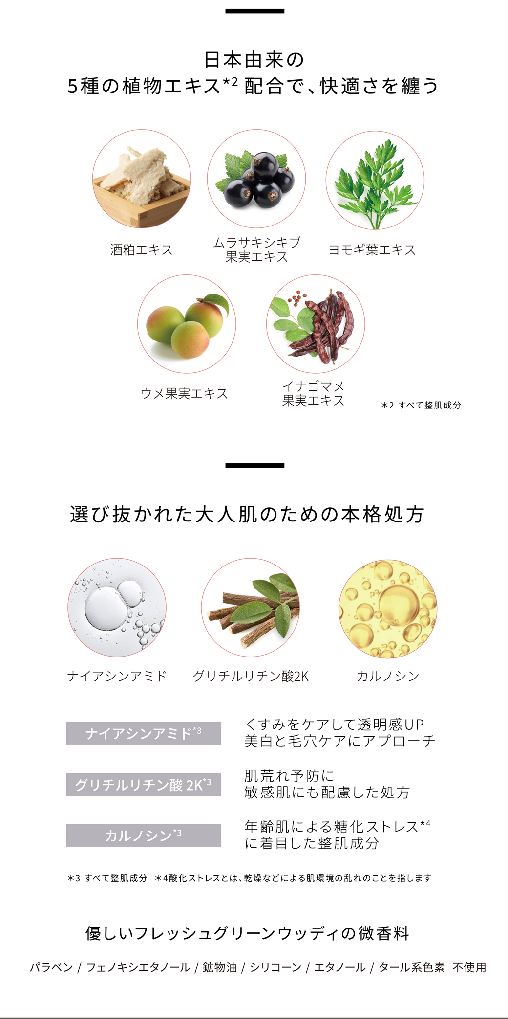 水、セバシン酸ジイソプロピル、セバシン酸ジエチルヘキシル、DPG、ナイアシンアミド、BG、グリセリン、ジエチルアミノヒドロキシベンゾイル安息香酸ヘキシル、ベヘニルアルコール、ビスエチルヘキシルオキシフェノールメトキシフェニルトリアジン、ペンチレングリコール、エチルヘキシルトリアゾン、アラキジルアルコール、ステアリン酸グリセリル(SE)、カルノシン、(ビフィドバクテリウム/乳酸桿菌)/ダイズ種子エキス発酵液、グリチルリチン酸2K、酒粕エキス、ムラサキシキブ果実エキス、ヨモギ葉エキス、ウメ果実エキス、ヒアルロン酸Na、イナゴマメ果実エキス、カプリリルグリコール、1,2-ヘキサンジオール、エチルヘキシルグリセリン、シリカ、アラキジルグルコシド、キサンタンガム、カルボマー、水酸化K、香料、酸化鉄
