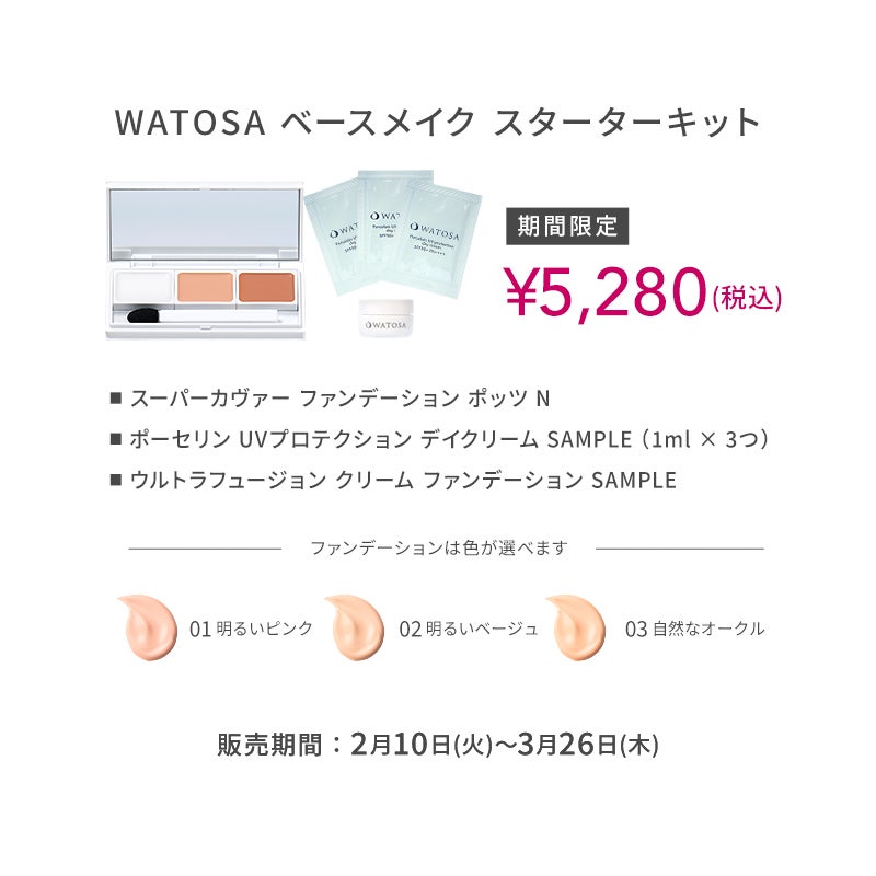 WATOSAのキーアイテムに 今だけ限定 新ベースメイクアイテムお試しサイズ<3日分>をセット! ※準備数が無くなり次第終了となります。 <内容> ●スーパーカヴァー ファンデーション ポッツ N 【現品】 〇[SAMPLE]ポーセリン UVプロテクション デイクリーム ×3 〇[SAMPLE]ウルトラフュージョン クリーム ファンデーション ×1 /【お好きな色をお選びください】