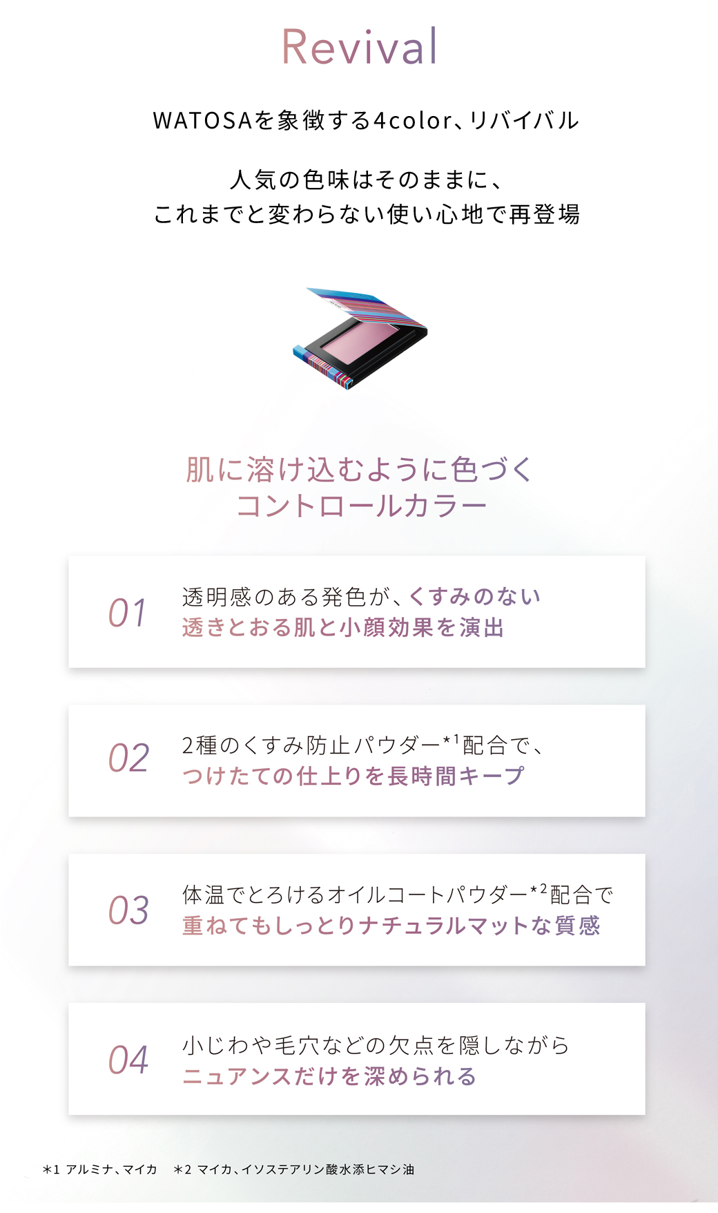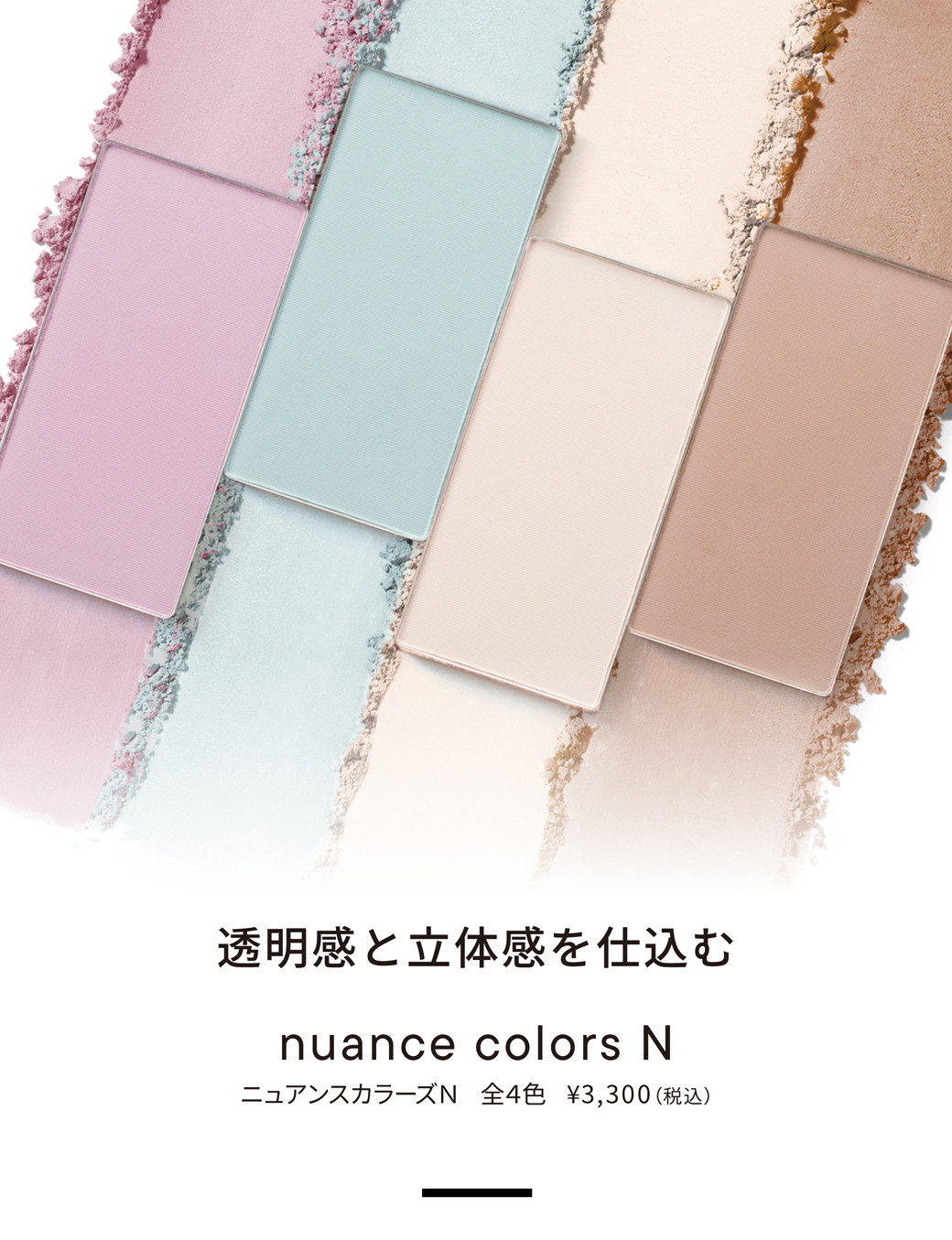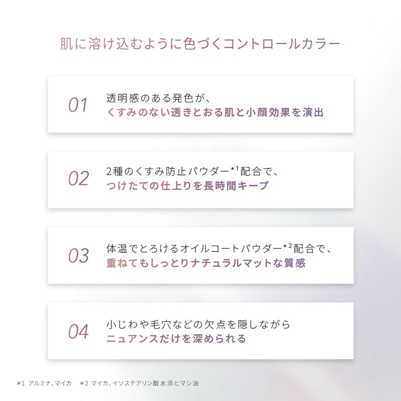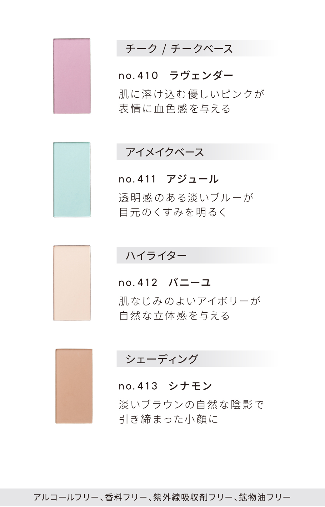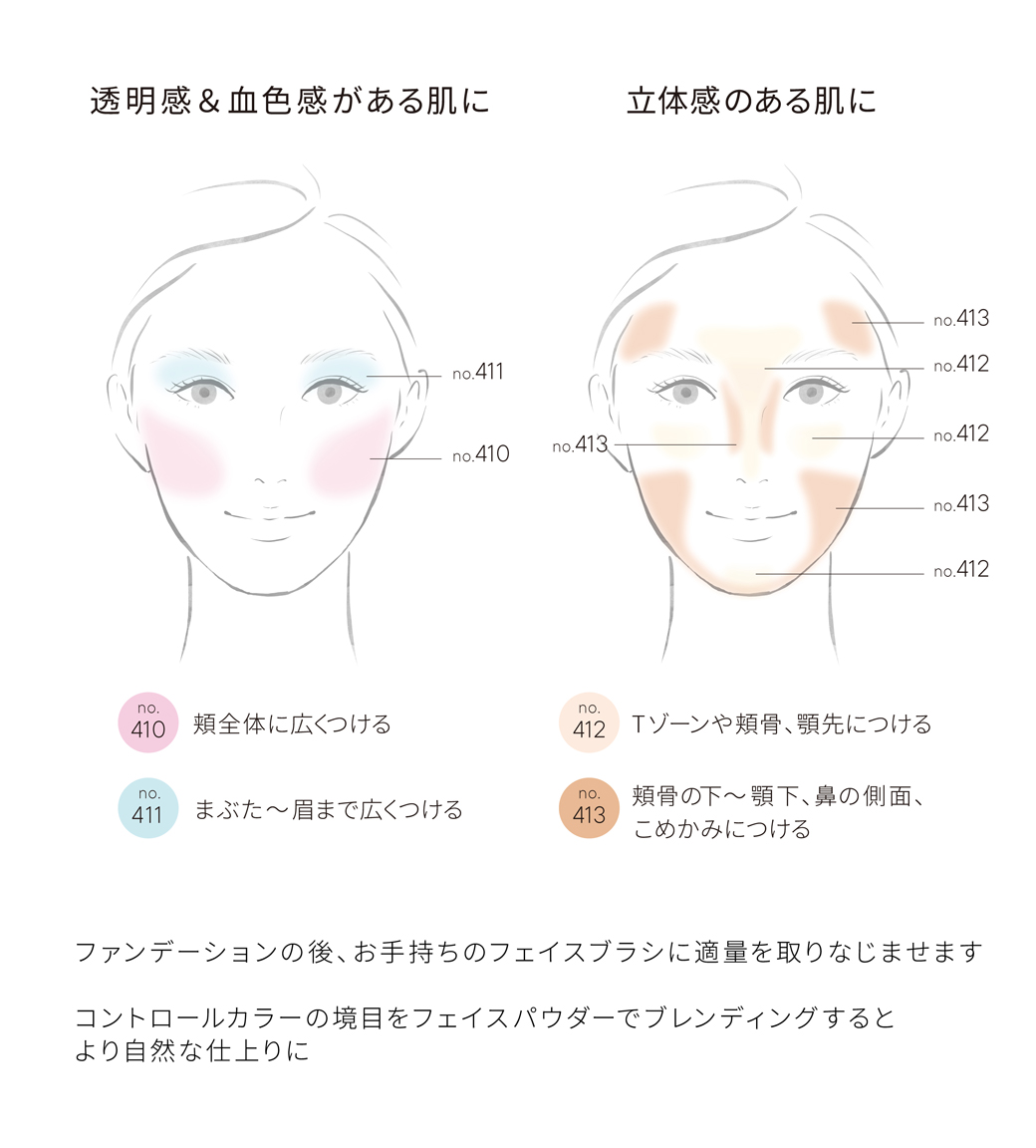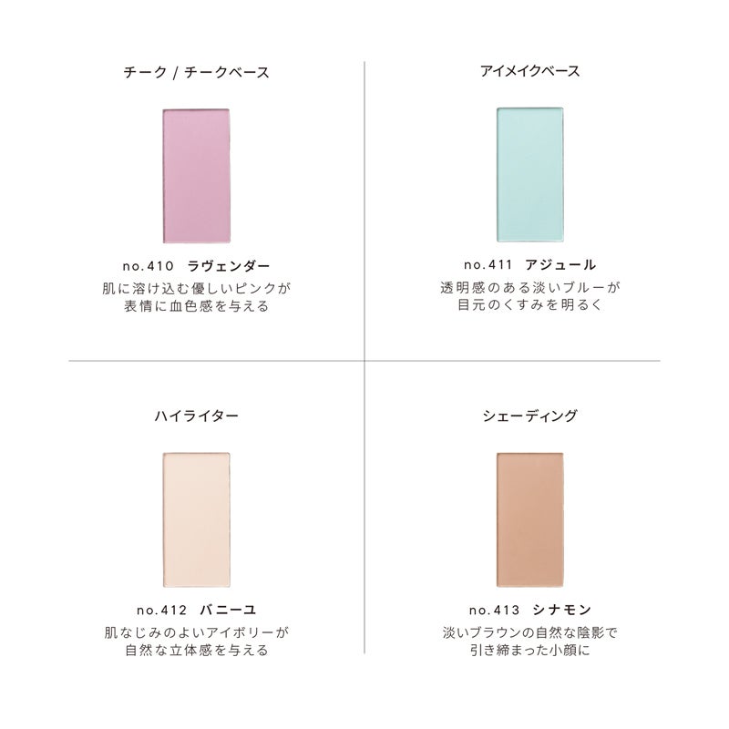 【no.410】 タルク、マイカ、ナイロン-12、ジメチコン、アルミナ、窒化ホウ素、ルイボスエキス、ヒメフウロエキス、ビルベリー葉エキス、水添パーム核油、イソステアリン酸水添ヒマシ油、エチルヘキサン酸セチル、トリ(カプリン酸/ミリスチン酸/ステアリン酸)グリセリル、トリエチルヘキサノイン、ヘキサヒドロキシステアリン酸ジペンタエリスリチル、ステアリン酸Mg、硫酸Ba、ロジン、BG、水、メチルパラベン、酸化チタン、酸化鉄、赤202 【no.411】 タルク、マイカ、ナイロン-12、ジメチコン、アルミナ、窒化ホウ素、水添パーム核油、イソステアリン酸水添ヒマシ油、エチルヘキサン酸セチル、トリ(カプリン酸/ミリスチン酸/ステアリン酸)グリセリル、トリエチルヘキサノイン、ヘキサヒドロキシステアリン酸ジペンタエリスリチル、ステアリン酸Mg、メチルパラベン、ハイドロゲンジメチコン、水酸化クロム、グンジョウ、酸化鉄 【no.412】 タルク、マイカ、ミリスチン酸亜鉛、ジメチコン、アルミナ、窒化ホウ素、炭酸Ca、ナイロン-12、エチルヘキサン酸セチル、水添パーム核油、イソステアリン酸水添ヒマシ油、トリ(カプリン酸/ミリスチン酸/ステアリン酸)グリセリル、トリエチルヘキサノイン、ヘキサヒドロキシステアリン酸ジペンタエリスリチル、ステアリン酸Mg、ヒドロキシアパタイト、オレイン酸ソルビタン、メチルパラベン、酸化鉄 【no.413】 タルク、マイカ、ナイロン-12、ジメチコン、アルミナ、窒化ホウ素、水添パーム核油、イソステアリン酸水添ヒマシ油、エチルヘキサン酸セチル、トリ(カプリン酸/ミリスチン酸/ステアリン酸)グリセリル、トリエチルヘキサノイン、ヘキサヒドロキシステアリン酸ジペンタエリスリチル、ステアリン酸Mg、酸化チタン、メチルパラベン、酸化鉄